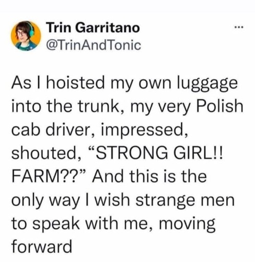 Can’t remember where but I read something like “Strong like bull, sexy like tractor”… every time I use that line (talking about myself), it kills!
