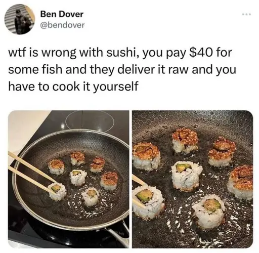 SSUPII@sopuli.xyz to Lemmy Shitpost@lemmy.world · 5 months agosushi deliverysopuli.xyzimagemessage-square2linkfedilinkarrow-up11arrow-down10