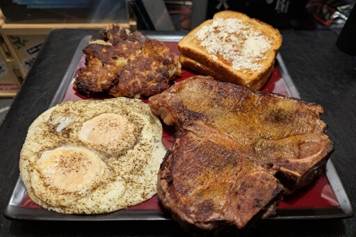 I’m having a rather shit day, so I decided to cook something nice for myself. T-bone steaks were on sale for $4.99/lb at a local grocer and I had some left over mashed potatoes. I threw a little flour and garlic powder into the potatoes to make a sort of latke, fried up a couple of eggs over easy, and made some toast.