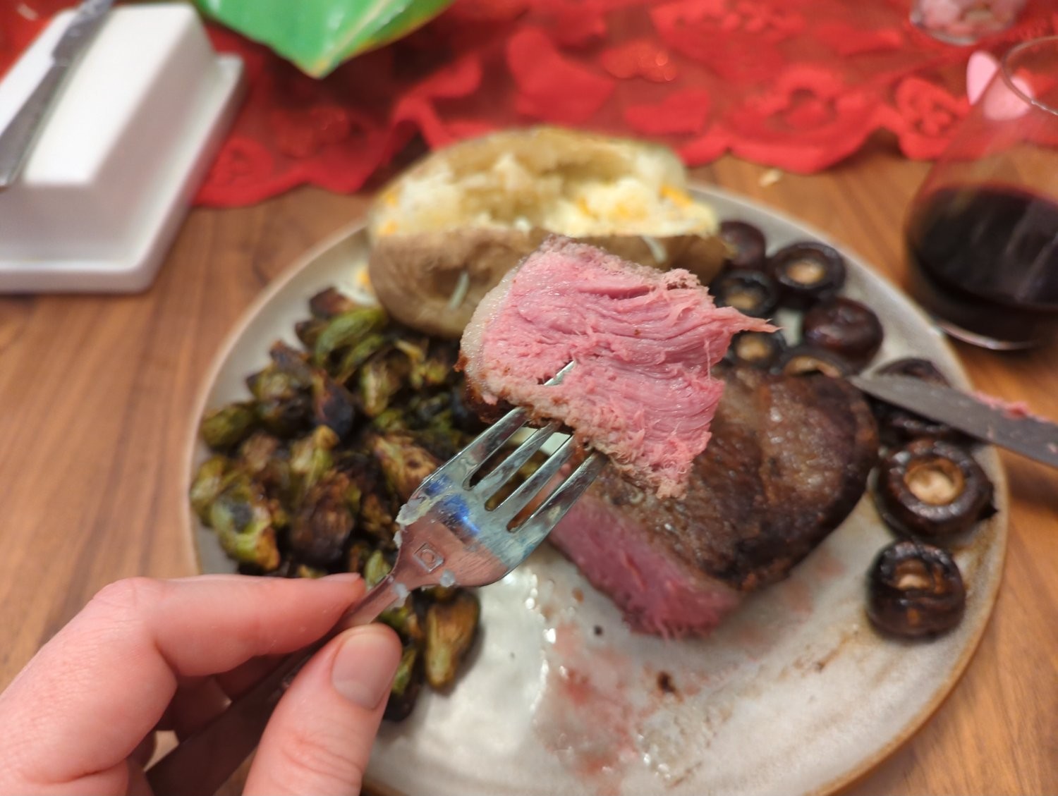 Made dinner for my fiancé last night. Sous vide strip steak, roasted brussel sprouts with balsamic reduction, sautéed mushrooms, and baked potato. Really happy with how it all turned out!