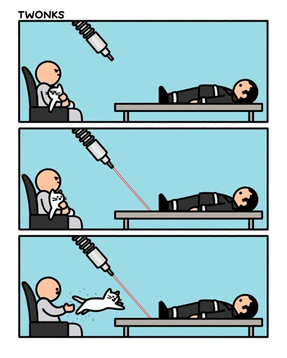 I imagine the cat gets laser es, then recombines like Terminator 2, then looks you in the eyes and says “eight remain” in plain English.
