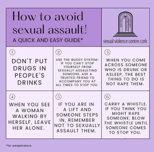 The message I hate is “don’t use these tips to minimize the chances to be raped, just teach boys not to rape”, as if that would be so easy. This meme is the same, making fun of useful tips.