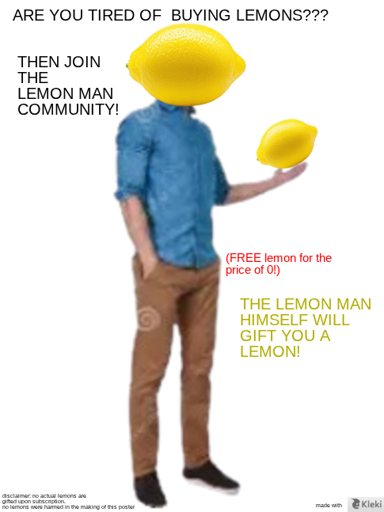 sorry for shitposting so much today I’m bored :| url to the lemon man community if you’d want to join: https://lemmy.world/c/thelemonman