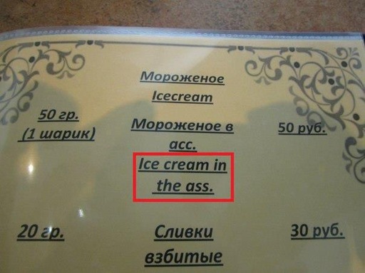 If anyone’s curious what happened to the translation here, the original Russian is abbreviated — the full phrase would be «мороженое в ассортименте» (ice cream in assortment) — but they abbreviated assortment and Russian doesn’t have articles so they use them when you wouldn’t expect.