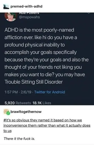 It’s funny cos when I was young I recall it being called (at least sometimes) ADD. So the H has been added (or made mandatory in the name) at a time when we’re realising that hyperactivity is not a necessary symptom.