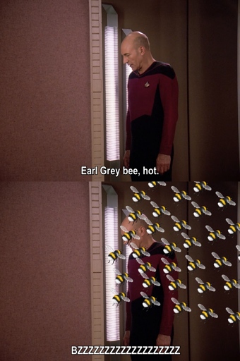 However, in this meme, Captain Picard says “bees” instead of “tea”. Bees are a swarming, flying insect. As a result, instead of tea appearing in the replicator, a swarm of bees appears.
