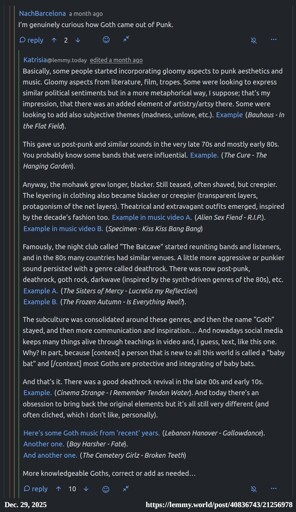 Example B. (The Frozen Autumn - Is Everything Real?).The subculture was consolidated around these genres, and then the name “Goth” stayed, and then more communication and inspiration… And nowadays social media keeps many things alive through teachings in video and, I guess, text, like this one. Why? In part, because [context] a person that is new to all this world is called a “baby bat” and [/context] most Goths are protective and integrating of baby bats.