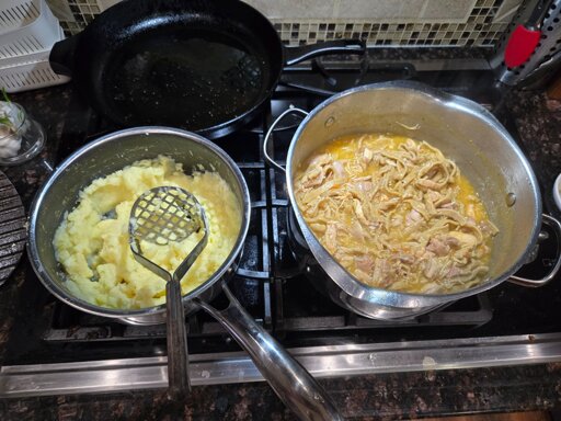 Turned 5 chicken bodies / parts from the freezer into chicken and noodles, 6 cups extra broth to freeze, and between 2 and 3 cups of chicken salad. Also homemade noodles and mashed potatoes from potatoes.