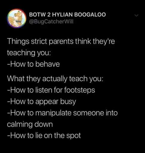 compostgoblin@lemmy.blahaj.zone to memes@lemmy.world · 9 months agoWhat strict parents actually teachlemmy.blahaj.zoneimagemessage-square0linkfedilinkarrow-up13arrow-down10